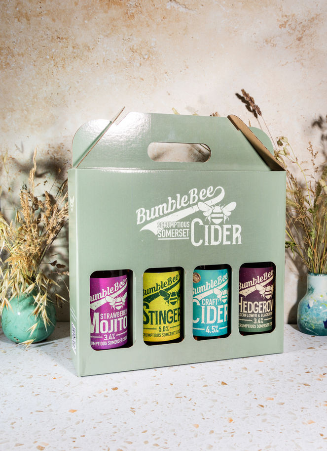 Our BumbleBee Cider Gift Box features four delicious 500ml bottles, one of each cider in our award-winning range. Each made using the best Somerset apples and supporting the Bumblebee Conservation Trust.